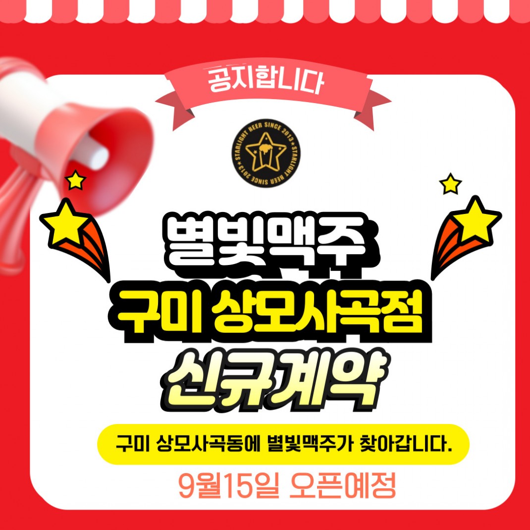 이번에 별빛맥주 구미 상모사곡점이 신규계약을 마치고 오픈을 준비중입니다.
